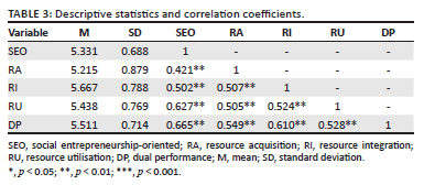 Table 3 exhibits the mean value, standard deviation and correlation coefficient of various variables. Social entrepreneurship orientation shows a significantly positive correlation with resource acquisition (R = 0.421, p < 0.01), resource integration (R = 0.502, p < 0.01), resource utilisation (R = 0.627, p < 0.01) and dual performance (R = 0.665, p < 0.01). Resource acquisition is significantly and positively correlated with resource integration (R = 0.507, p < 0.01), resource utilisation (R = 0.505, p < 0.01) and dual performance (R = 0.449, p < 0.01). Resource integration is significantly and positively correlated with resource utilisation (R = 0.524, p < 0.01) and dual performance (R = 0.610, p < 0.01). And resource utilisation shows a significantly positive correlation with dual performance (R = 0.528, p < 0.01). The correlation among various variables shown by the results is consistent with the theoretical expectations, providing support for the subsequent hypothesis test.