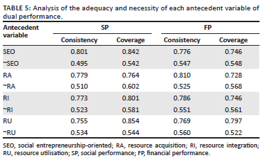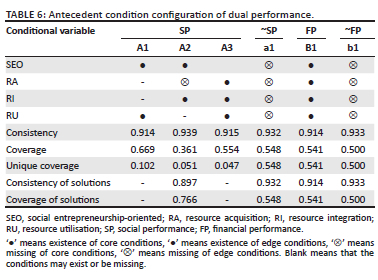 The first step is to calibrate the variables involved in the study. This article calculates the average of four continuous antecedent variables: social entrepreneurship orientation, resource acquisition, resource integration, and resource utilisation. Then, according to the criteria proposed by Veríssimo (2018), which are 5% (fully out), 95% (fully in), and 50% (crossover point), the data were calibrated using the Calibrate function in fsQCA 3.0 software. This converts the absolute values of conditions and results into fuzzy set membership degrees of corresponding conditions and results. The second step is to analyse the adequacy and necessity of each antecedent variable of dual performance after calibrating the data. The analysis results are shown in Table 5. It can be seen that although social entrepreneurship orientation, resource acquisition, resource integration and resource utilisation can individually explain most of the dual performance, their consistency and coverage are still less than 1, indicating that these conditions cannot fully explain the dual performance. Therefore, it is necessary to combine multiple antecedent conditions for configuration analysis.