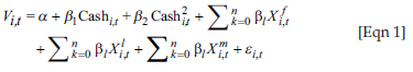 This study predicts a nonlinear relationship between firm value and corporate cash holdings. We, therefore, deploy a quadratic function that regresses firm value against the variable Cash and its square (Cash2) as used in Martinez-Sola et al. (2013) and Nguyen et al. (2016). The regression equation is specified as follows: