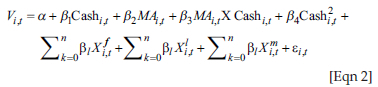 To test whether managerial ability acts as a moderator of the impact of cash holdings on firm value, we use the following model: