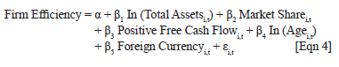 The company factor and managerial factor are both included in the DEA score for technical efficiency, much like the conventional measures of managerial skill such return on assets (ROA). Demerjian et al. (2012) employ a second step to quantify operational efficiency by separating the managerial factor from the firm-related factor in order to achieve a more accurate estimate of managing skill. The technical efficiency of a firm is regressed against six firm-specific parameters (firm size, market share, positive cash flow, age, complex multi-segment, and foreign operations) that either support or undermine managerial efforts. The following is how the authors estimate a Tobit regression: