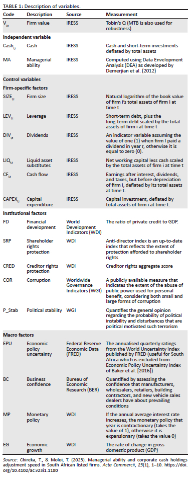The purpose of this study is to fill this gap by empirically testing the relationship between firm's value and corporate cash holdings in South African firms and how managerial ability moderates this relationship. While South Africa has some characteristics similar to developed countries, such as modern infrastructure and a mature financial sector, it is distinctly a developing country with a unique historical context, economic challenges, and demographic makeup different from most countries that significantly influences its development path in distinct ways.