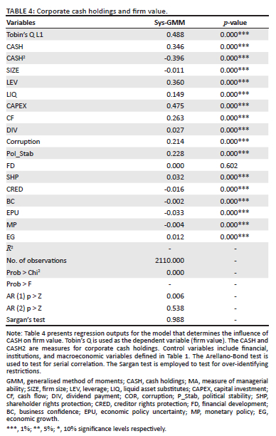 We estimate Equation (1) the preferred system generalised moment of movement (system-GMM). We also report estimates from fixed effects (FE), random effects (RE), and the GMM estimators for robustness. The dependent variable, Tobin's Q, is used to represent firm value. The results in Table 4 show that there is a significant (at 1%) and positive relationship between firm value and CASH. The results also show that firm value and CASH2 are significantly, but inversely, related. The signs of these two coefficients are consistent across the four estimators indicating that the relationship is robust.