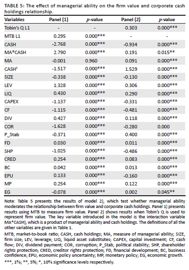 We present the results of the moderating role of managerial ability (equation 2) in Table 5. The results are estimates from the system-GMM estimator. For robustness, we introduce Panel 1, which uses the MTB ratio to proxy firm value while panel 2 shows results when Tobin's Q is used as the dependent variable (as in Equation 1). Both model (1) and (2) reveal that CASH has an inverse effect on firm value. The coefficients of the interaction variable (MA*CASH) in models (1) and (2) are positive and significant at 10% and 1% levels, respectively. These findings indicate that the negative relationship between cash holdings and firm value is reversed by high managerial ability. This conclusion corroborates our second hypothesis (H2) that managerial ability does moderate the association of firm value and corporate cash holdings. Highly capable managers are more efficient in their use of cash holdings to achieve competitive advantage and increase market power and market share. Moreover, high ability managers achieve goal congruency with shareholders by reducing information asymmetries and reducing agency costs (Ha, 2016). As such shareholders will value cash holdings, in firms with high ability managers, more favourably.