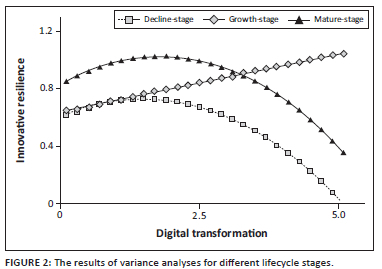 Enterprise lifecycle stage - Decline: Enterprises face challenges such as declining market share in the decline stage, decreased profitability, increased competitive pressure, outdated products or services, limited cash flow, organisational rigidity and slow decision-making (Dickinson, 2011). Although digital transformation brings about high fluidity and integration of data and information (Zhu et al., 2021), enhancing proximity with external investors and establishing a transparent consensus space with stakeholders, thus alleviating financing constraints to some extent and promoting the resilience of the innovation system in crisis (Liu et al., 2023), the lack of funds and organisational rigidity in declining companies (Mirković et al., 2019) lead to the proliferation of conservative thinking, making it difficult to synchronously update management skills to match the requirements of digital transformation. This reduces the range of digital transformation pressure that innovation resilience can withstand. Compared to mature companies, the digital empowerment effect in declining companies reaches its peak faster (Liu et al., 2023). Based on the above analysis, the following hypothesis is proposed: