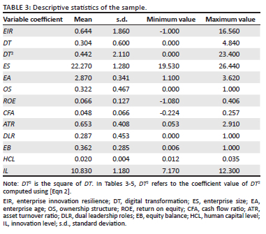 This study rigorously controls for variables related to corporate organisational structure, financial characteristics and governance practices. These include enterprise size (ES), age (EA), ownership structure (OS), return on equity (ROE), cash flow ratio (CFA), asset turnover ratio (ATR), dual leadership roles (DLR) and equity balance (EB). Additionally, human capital level (HCL) and innovation level (IL) as control variables are also considered, acknowledging their impact on innovation resilience across different regions. Furthermore, to mitigate interference from industry and year effects, time and industry effects are controlled. Table 2 presents the definitions and notations of the control variables.
