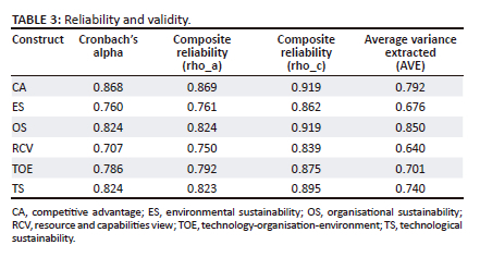 The model indicators include the TOE framework, OS, RCV, CA, and ES, assessing sustainability and competitive outcomes in hotels (Table 1).