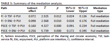 To examine the hypothesised full mediation effect of technology attitude variables (TSF and ENJ) between sustainable fashion variables (FI and PSCE) and new service intention (PUI), we applied the non-parametric bootstrapping technique using 5000 resamples in SmartPLS 4. As suggested by Preacher and Hayes (2008), significance was assessed based on the 95% bias-corrected confidence interval (CI) of the indirect effect. The mediation effect is considered statistically significant if the CI does not include zero. As shown in Table 5, the direct path from FI to PUI was not included in the model, as the mediation structure assumed full mediation. The results confirmed a significant indirect effect of FI on PUI through TSF (β = 0.072, t = 2.525, p < 0.001), with a 95% bias-corrected CI of (0.024, 0.136), which does not include zero. Similarly, the indirect effect of FI on PUI through ENJ, along with the mediation effects of TSF and ENJ between PSCE and PUI, also demonstrated significant indirect effects. As the structural model was defined without the direct path connecting the sustainable fashion variables (FI and PSCE) and the new service intention variable (PUI), these results support the existence of a full mediation effect. This indicates that the influence of sustainable fashion variables (FI and PSCE) on the new service intention variable (PUI) is fully transmitted through technology attitude variables (TSF and ENJ).