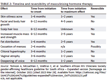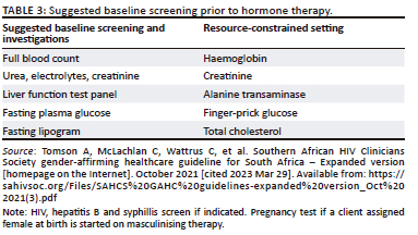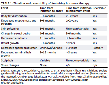 2. Tomson A, McLachlan C, Wattrus C, et al. Southern African HIV Clinicians Society gender-affirming healthcare guideline for South Africa - Expanded version [homepage on the Internet]. October 2021 [cited 2023 Mar 29]. Available from: https://sahivsoc.org/Files/SAHCS%20GAHC%20guidelines-expanded%20version_Oct%202021(3).pdf [ Links ]