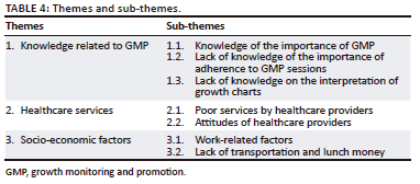 Three themes emerged from data analysis (as shown in Table 4): (1) knowledge related to GMP, (2) healthcare services and (3) socio-economic factors. Moreover, sub-themes were developed from each theme.