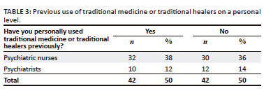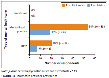 The majority of mental healthcare providers (73%) preferred the mental healthcare practice (the majority being 54%) (Figure 1). The latter results were followed by 27% of respondents who indicated that they preferred both mental health practices. None of the participating mental healthcare providers (both psychiatric nurses and psychiatrists) preferred traditional medicine only. The results show no significant difference between psychiatrists' and psychiatric nurses' responses.