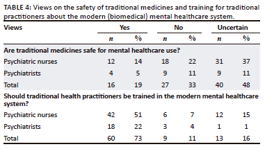 Results revealed that 48% of mental healthcare providers were uncertain about the safety of THM. Only 19% of mental healthcare providers considered THM to be safe. In the study, 31% of mental healthcare providers expressed a need to be educated about traditional medicine. The same sentiments were shared by the THPs in a study conducted in KwaZulu-Natal, South Africa. The majority of those respondents were more than willing to learn and support the integration of traditional medicine into modern medical healthcare practices.13