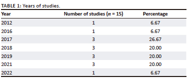 Numerical data for the findings were analysed using Microsoft Excel, which highlighted the years of the studies, the types of studies and the geographical coverage of the studies. A total of 15 studies were selected from the literature. The articles selected were from the years 2012 to 2022. Table 1 shows the years in which the articles retrieved were published.