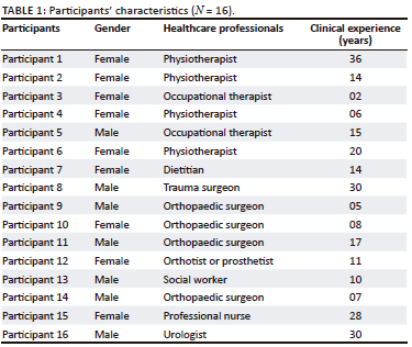 Four physiotherapists, two occupational therapists, one dietitian, one trauma surgeon, four orthopaedic surgeons, one orthoptist or prosthetist, one social worker, one professional nurse and one urologist participated in the study. Table 1 reflects the details of the HPs.