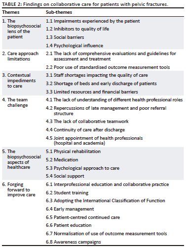 METHODS: A qualitative descriptive phenomenological approach was utilised to explore current practices and innovations of healthcare professionals (HPs) in Tshwane academic hospitals in the collaborative management and rehabilitation of patients with pelvic fractures, using semi-structured interviews. Thematic analysis was used to analyse data