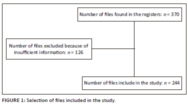 A total of 126 patient files were excluded because they did not meet the inclusion criteria. Finally, 244 patient files were included in the study. Figure 1 illustrates the outcome of the file selection process.