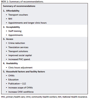 A community-based ambulance service would be a facilitator to access by expansion of the Emergency First Aid Responder35 (EFAR) programme. Emergency First Aid Responder is a programme that trains community members in basic first aid with the idea that they can be called upon as the first responders to an emergency within the community and then co-ordinate with EMS. Emergency First Aid Responders could assist with basic home care, directing the ambulance to the location when called and to ascertain if an ambulance is really warranted. Strategies to address language barriers such as on-site translators or 24-h access to the Folio translation service are needed. High crime rates require community-wide interventions. False Bay Hospital is the only 24-h facility in the Far South. Extended opening hours at local PHC services will improve the availability of services and may overcome some transport barriers.