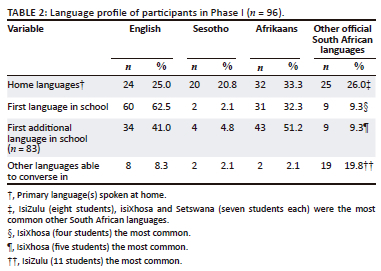 The high response rate in Phase I and the gender distribution, which reflects the study population, increase the representativeness of the participants from Phase I. The participants had diverse home languages, including Sesotho, Afrikaans, English and other official languages. However, the majority received their school education in English. Most of those with an additional language learned from their family, school or 'picked it up' in the community. Only a small percentage (18.9%) learned an additional language informally while at university.