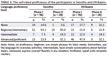 The largest percentage of the study participants in Phase I rated themselves as beginners or elementary (54.2%) in Sesotho, whereas the largest percentage rated themselves as either advanced or proficient (47.9%) in Afrikaans (Table 3). Participants in Phase II were more likely to rate themselves as proficient in Sesotho and less likely to rate themselves as proficient in Afrikaans than those participating in Phase I.