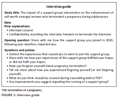 In 2018 the first researcher interviewed women who terminated a pregnancy in adolescence at a community health centre (CHC) for her doctoral study titled 'Self-forgiveness for women who terminated pregnancy in adolescence'. Some major findings of this study were that women suffered self-condemnation and carried a burden of secrecy.17 The findings motivated the first researcher to encourage and oversee women who terminated a pregnancy and were lacking self-worth, to form a support group and to subsequently follow up its impact on these women through this study. As a secular intervention, the support group was formed in February 2020.