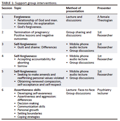 Two participants volunteered to co-ordinate the group activities under the researcher's guidance. Meetings were intended to clarify feelings, reduce self-condemnation and isolation, facilitate appropriate mourning, increasing self-esteem and self-worth and bring closure to the TOP experience.18 Teaching methods involved lectures, discussions, questions and answers as well as sharing on emotional growth.