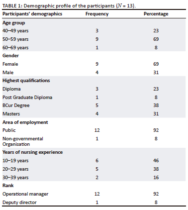 Thirteen participants (nine females and four males) were involved in this study and most participants were females. Their ages ranged from 42 years to 64 years, their work experience was between 11 years and 34 years, and most had relevant qualifications; the highest being a master's in psychiatric nursing science. These demographics (see Table 1) illustrate that participants were eligible to participate in the study.