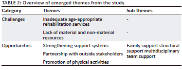 The data were analysed guided by Braun and Clarke's17 thematic analysis process following these six steps: (1) familiarisation with the data, (2) generating initial codes, (3) searching for themes, (4) reviewing the themes, (5) defining and naming the themes, (6) producing the final report. Interviews were transcribed verbatim, and the transcripts were read several times so that the researcher could become familiar with and immersed in the data to arrive at the findings. An independent coder not involved in this study assisted in data analysis to ensure objectivity. Data were coded and categorised into five themes: inadequate age-appropriate rehabilitation services; lack of material and non-material resources; support systems; partnerships with outside stakeholders; and the promotion of physical activities.