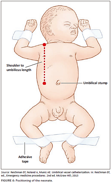 Obtain informed consent from the parent or guardian for the procedure. The risks, benefits and potential complications of the procedure should be discussed. In emergency situations where this is not possible, consent is implied. Place the neonate in a cot with a radiant warmer, restrained in a supine position (Figure 4)15 and attach the cardiac monitor and pulse oximetry. Select the appropriate catheter size for the body weight and calculate the estimated length to be inserted. The 3.5 French catheters are used for neonates with body weight less than 3.5 kg while the French 5 catheters are used for neonates who weigh 3.5 kg or more.5,13,14