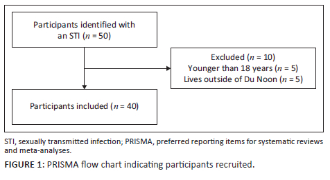 Participants presenting to the walk-in clinic who met the criteria for screening for symptoms of an STI were invited to participate in this study. Recruitment of patients occurred over a period of 2 weeks in May 2021. The researcher was primarily responsible for recruitment, with an enrolled nurse assistant (ENA) working at Du Noon CHC assisting with translation when required. This was arranged and agreed upon by the Du Noon CHC Out Patient Department (OPD) Operational Nursing Manager.