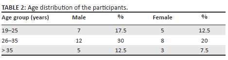 The total number of respondents approached by the researcher was 50, and 40 were found to be eligible. Ten respondents were not eligible because of various reasons, such as being younger than 18 years old, or not living in the Du Noon community. Information saturation was obtained from the 40 participants for the open-ended questions. Table 1 shows the gender distribution and whether they were South African or not, and Table 2 provides the age distribution of the participants.