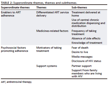 Two superordinate themes emerged from data analysis: enablers to ART adherence and psychosocial factors promoting adherence.