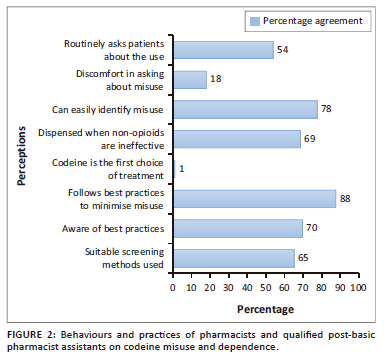 BACKGROUND: Pharmacy professionals working in community pharmacies frequently provide pharmacist-initiated therapy, including codeine-containing medicines. Codeine is an opioid with great potential for misuse, adding to the global opioid epidemic burden. Professional pharmacy personnel are the first intervention point in relation to management of codeine use. This study highlights the importance of pharmacy professionals' perceptions and behaviours in combatting the opioid epidemic