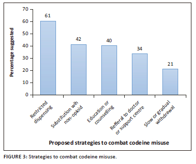 A study conducted in Ireland, United Kingdom and South Africa20 showed that pharmacist intervention attempts centred on offering alternative first line pain management prior to supplying the codeine product or offering a product with similar packaging. In line with this, the present study found that after restricted supply (the most used intervention), the pharmacy professionals opt for substitution of codeine-containing medicines with non-opioid products. Hoppe et al.12 reported that 40% of the pharmacists counselled patients on the risks of taking excessive codeine-containing products. The result of the current study is in concordance with the reported literature. In addition to these most frequently used strategies, few participants reported using slow or gradual withdrawal of the codeine-containing products as an intervention.