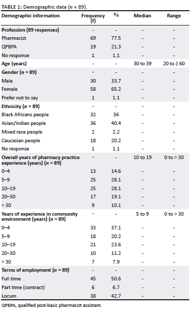 The demographic information (Table 1) shows that the majority of the participants were female (n = 58; 65.2%) while the median age was 30-39 years. Most of the participants were Asian/Indian people (n = 36; 40.4%), and 32% were black South Africans. The median total number of years of experience was in the range of 10-19 years while the median for years of experience in a community pharmacy environment was 5-9 years. Half of all participants (n = 45; 50.6%) were employed full time within the community pharmacy environment, while 38 (n = 42.7%) practised as locums.