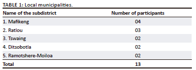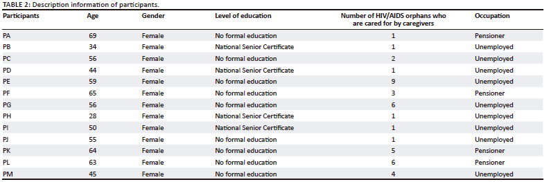 A total of 13 caregivers of children orphaned by HIV/AIDS orphans voluntarily participated in this study. Participated in the study were adults, with ages ranging from 28 to 69 years. Nonprobability purposive sampling was employed to determine eligibility to participate in the study. Only caregivers residing in five local municipalities of Ngaka Modiri Molema and have experience of caring for children orphaned by HIV/AIDS for more than 1 year were eligible to participate in this study (see Table 1 for more details on caregivers' demographic information). In terms of exclusion, caregivers caring for orphans not orphaned by HIV/AIDS were not considered to participate in the study.