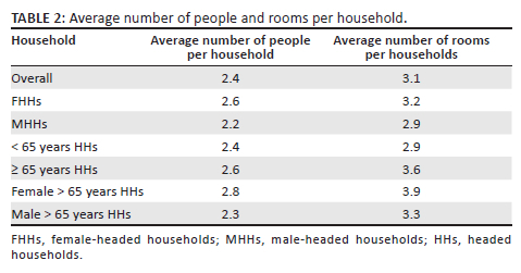 Of the 13 985 households, the majority were headed by someone < 65 years (81.3%), and there were marginally more female-headed households (FHHs) (51.8%) than male-headed households (MHHs) (48.2%). The average number of people per household was 2.4 and the average rooms per household was 3.1. Table 2 depicts the average number of people and rooms per household by household-head demographics. On average, FHHs has more people (2.6) than MHHs (2.2) but also had slightly more rooms (3.2 vs. 2.9). The ≥ 65 years HHs had slightly more people on average (2.6) than < 65 years HHs (2.4) but had substantially more rooms (3.6 and 2.9, respectively). Female ≥ 65 years HHs had not only the highest average of people per household (2.8) but also the highest number of rooms per household (3.9) - both higher than male ≥ 65 years HHs (2.3 people and 3.3 rooms).