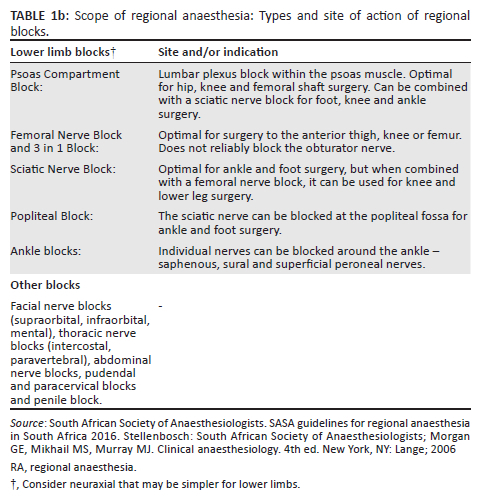 Different types of regional anaesthesia (RA) may include local blocks, peripheral nerve blocks, nerve plexus blocks, intravenous RA and neuraxial (epidural and spinal) blocks. When effectively delivered, regional blocks can provide sufficient analgesia to carry out surgical procedures. Combining a local block and light sedation (such as ketamine) provides a good alternative to GA for minor procedures. They are also used to augment GA providing additional analgesia that can last hours to days.2 Nerve blocks are already commonly used in operating theatre environments and are now being used more frequently in emergency departments (ED) as an alternative to traditional methods of analgesia. This provides an accessible, safe and cost-effective alternative, particularly in low-resource settings such as sub-Saharan Africa, where safe and accessible surgical and anaesthetic care, is often limited.3,4 Adaptive leadership, training and adoption of regional techniques has lagged in developing countries despite it being a well-recognised option for over a decade with many potential benefits. In ED, musculoskeletal pain is a common and frequently neglected complaint. Regional blocks can safely be used for a variety of pathologies, sparing the use of opioids and shortening time to discharge in often overcrowded EDs.5 Additional advantages include avoidance of airway manipulation, reduced doses and side effects of systemic drugs, faster recovery time and significantly lower pain levels after surgery.6 Ultrasound-guided RA is not yet part of the formal training of emergency medicine registrars in South Africa, and certainly trained providers are very scarce in the district services. This continuous professional development (CPD) article aims to provide guidance on a few aspects of RA, addressing common concerns in primary care and district hospitals where anaesthesia is commonly provided by generalist medical officers rather than dedicated anaesthetic practitioners. This article will allow revision for generalist doctors on the different types and indications for plexus, peripheral and local nerve blocks (see Table 1a and 1b for the different types of RA). We will briefly describe important principles of practice, informed consent, preparation of the patient and equipment and a few common techniques used in primary care emergency settings. Frequently, equipment such as nerve stimulators and ultrasound are lacking in district hospitals, resulting in a reliance on anatomical landmarks. Advocacy for ultrasound-guided RA, which can improve access to safe and reliable anaesthesia in low-resource countries as it becomes more user-friendly, durable and affordable, should remain a target.3 We discuss the properties and maximum doses of LA drugs that are used, as well as recognising symptoms and signs of toxicity when using these drugs. We briefly discuss a failed block and other potential complications that may occur.