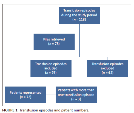 As illustrated by Figure 1, the 76 episodes that met the transfusion criteria represented 72 patients - two patients had two separate transfusion episodes each and one patient had three transfusion episodes. Each transfusion episode was captured on a separate data sheet.