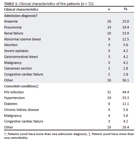 Most patients were females (n = 54; 75.0%). The median age was 47 years (range 13-89 years, interquartile range [IQR]: 32-66 years). Table 1 summarises the patients' admission diagnosis and comorbidities. Anaemia was the most common admission diagnosis (25.0%), followed by pneumonia (19.4%) and renal failure (13.9%). Under the admission diagnoses categorised as 'Other', the most common were delirium (4.2%), peptic ulcer disease (PUD) (2.8%) and postpartum haemorrhage (PPH) (1.4%). The most common comorbidities were HIV infection (44.4%) and hypertension (33.3%). Other underlying chronic medical conditions were also identified, such as pulmonary tuberculosis (4.2%), venous ulcer (2.8%) and angioectasis, asthma, abnormal uterine bleed, cataract, COPD, epilepsy, hypothyroidism, iron deficiency anaemia, myelofibrosis, PUD, valvular disease, fibroids and rectal bleed, all at 1.4%, respectively.