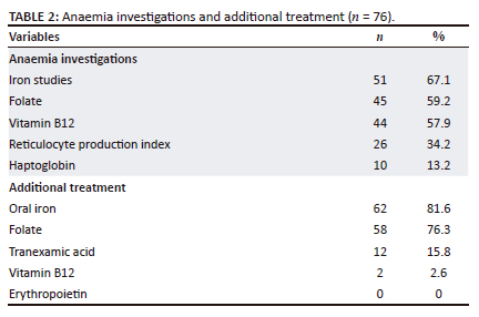 Table 2 highlights the various investigations performed and additional treatment given. Oral iron therapy was the most commonly prescribed treatment (n = 62; 81.6%). In 76.3% (n = 58) of the transfusions, folate was given as an additional treatment. No patient received erythropoietin, while a small percentage received the antifibrinolytic agent tranexamic acid (n = 12; 15.8%) and vitamin B12 (n = 2; 2.6%).