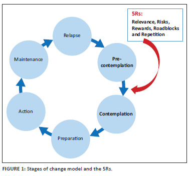 According to Prochaska and DiClemente's stages of change model, '… change is not a linear progression through the stages; rather, most clients move through the stages of change in a spiral pattern'.9 Figure 1 indicates where the 5Rs belong in the cycle of change.