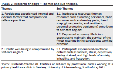 Table 2 gives insight into the themes and sub-themes that were unveiled after data analysis. The overview of the themes and sub-themes was that factors inside and outside the participants' world contributed towards them not to promote self-care practices. The inability of the participants to practise self-care appeared to have unfavourable consequences for them.
