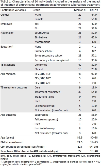 Among the 50 patients included in the analysis, median age was 32.5 years (IQR 30-38), 56% were female, 58% were unemployed, and almost half (48%) were not of South African nationality. The diagnosis of TB was bacteriologically confirmed in 80%. Median CD4 count was 124 (IQR 94-193). The median time to ART initiation was 27 days (IQR 13-48), and almost all (92%) participants initiated an ART regimen containing efavirenz, lamivudine and tenofovir. TB treatment outcome was successful in 82%. Only 56% of participants achieved viral load suppression, defined as a viral load < 400 copies/mL in the 6-12 months of ART (Table 1).