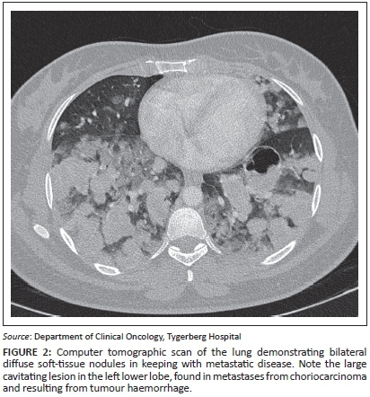 A 20-year-old woman (gravida 2, para 0, miscarriage 1) presented with a history of haemoptysis, grade IV dyspnoea and a raised B-HCG level. She was known to have had a previous molar pregnancy, diagnosed three years previously. On clinical examination, symptoms and signs of thyrotoxicosis were present. Staging examinations included a lung CT that confirmed numerous bilateral, diffuse soft-tissue nodules throughout both lung fields in keeping with metastatic disease (Figure 2). Abnormal laboratory studies revealed a B-HCG value >898 400 IU/L (<5 IU/L), T4: 47 pmol/L (10.3 pmol/L - 21.9 pmol/L), and a CD4 count of 200 cells/μL (500 cells/μL - 2010 cells/μL); a HIV enzyme-linked immunosorbent assay (ELISA) test was positive. Direct microscopy for acid-fast bacilli was negative. She was diagnosed with a FIGO Stage III:15 high-risk choriocarcinoma in a newly diagnosed HIV-positive patient.