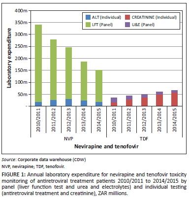 METHOD: NHLS Corporate Data Warehouse (CDW) data were extracted for HIV conditional grant accounts to assess ART toxicity monitoring laboratory expenditure between 2010/2011 and 2014/2015. Data were classified based on the tests requested, as either panel (LFT or urea and electrolytes) or individual (alanine transaminase or creatinine) tests.