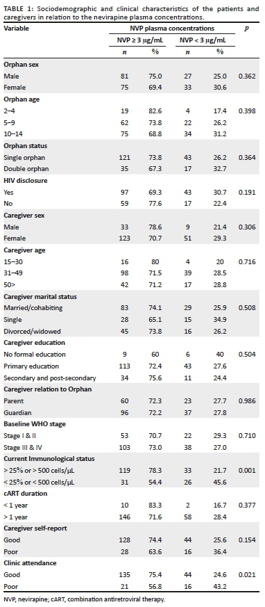 Descriptive statistics for categorical sociodemographic characteristics of participants such as orphan sex, orphan status, HIV disclosure, caregiver age, caregiver marital status, caregiver relation to orphan, WHO status, caregiver self-report and clinic attendance were described as frequencies and proportions. For quantitative variables such as orphan age, caregiver age and NVP plasma concentrations, means with standard deviations (s.d.) or medians with interquartile range (IQR) were analysed using independent t-test and Chi-square test (χ2). The outcome variable was NVP plasma concentration (either below or above 3 µg/mL as a measure of adherence). Univariable and multivariable logistic regression and kappa statistic were used to assess agreement between adherence measures (caregiver report, clinic attendance, CD4 cell count and NVP plasma concentration). The dependent variable was adherence based on NVP plasma concentration. Variables in univariate analysis were included in multivariate analysis to assure that all pertinent and potentially predictive variables were studied. The association between independent and dependent variables was measured using odds ratios (OR) with their corresponding 95% confidence intervals (CI). The significance level for this study was set at a p-value of < 0.05. Statistical Package for the Social Sciences (SPSS) version 20 was used for the analysis.