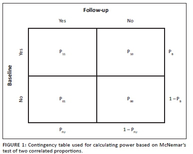 For study planning purposes, we computed sample size requirements (and corresponding power) based on the dichotomous outcome and engagement in concurrent sexual partnership(s) during the previous 3 months. We used McNemar's test for two correlated proportions to determine the number of participants enrolled and the corresponding power to detect the smallest, clinically meaningful difference in the proportion of men who report engaging in a concurrent sexual partnership between baseline and 3 months post-circumcision.17Figure 1 shows the summary of the proportions associated with all possible responses under this framework.