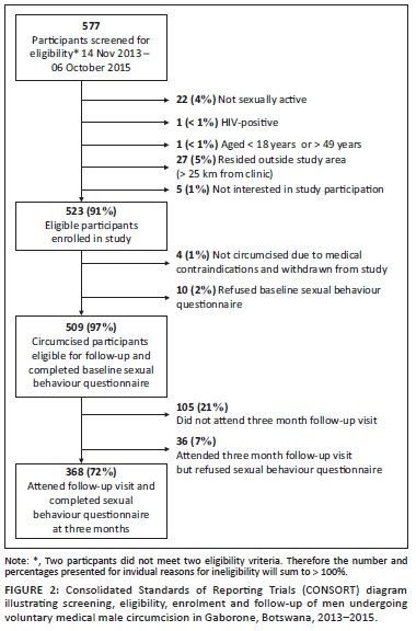 Between November 2013 and October 2015, research staff screened 577 men preparing to undergo VMMC for study participation (Figure 2). A total of 528 (92%) participants were determined to be eligible for participation and 523 (91%) subsequently enrolled. Reasons for ineligibility included not sexually active (4%), residence outside of the area (5%), HIV infection (< 1%) and age < 18 years or > 49 years (< 1%). Four individuals who met study eligibility criteria and consented to study participation were not circumcised because of medical contraindications that were identified before the procedure. Amongst the 509 circumcised participants who completed the baseline sexual behaviour questionnaire, 368 (72%) attended the follow-up visit and completed the sexual behaviour questionnaire at 3 months post-circumcision. Because of missing data on specified outcomes, 353 were included in the analysis examining the number of sexual partners in the past month, and 311 were included in the sexual concurrency analysis.