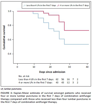 CONCLUSION: In the current study of adult PLWH presenting to hospital with HIV/CCM, four or more LPs in the first 7 days following admission and the initiation of treatment were associated with a 17.4% reduction in absolute risk of in-hospital mortality and a 20% reduction in relative risk of in-hospital mortality. This mortality difference was noted in patients who survived and were in hospital at the time of the 7-day study census and persisted until the time of hospital discharge
