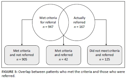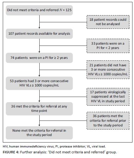 RESULTS: In the study period, 947 patients met criteria for third-line referral and 167 patients were referred. Comparison revealed a poor overlap of only 42 patients. In multivariate analysis, factors associated with referral included receiving care at a hospital rather than a primary healthcare facility (adjusted odd ratios [aOR] = 2.15, 95% confidence interval [CI] 1.1-4.2), a higher number of viral load [VLs] ≥ 1000 copies/mL whilst on a protease inhibitor (PI) (aOR = 1.2, 95% CI 1.01-1.42) and a greater number of years on a PI (aOR = 1.25, 95% CI 1.07-1.46). Patients with a 6-month gap in dispensing were less likely to be referred (aOR = 0.37, 95% CI 0.17-0.81.
